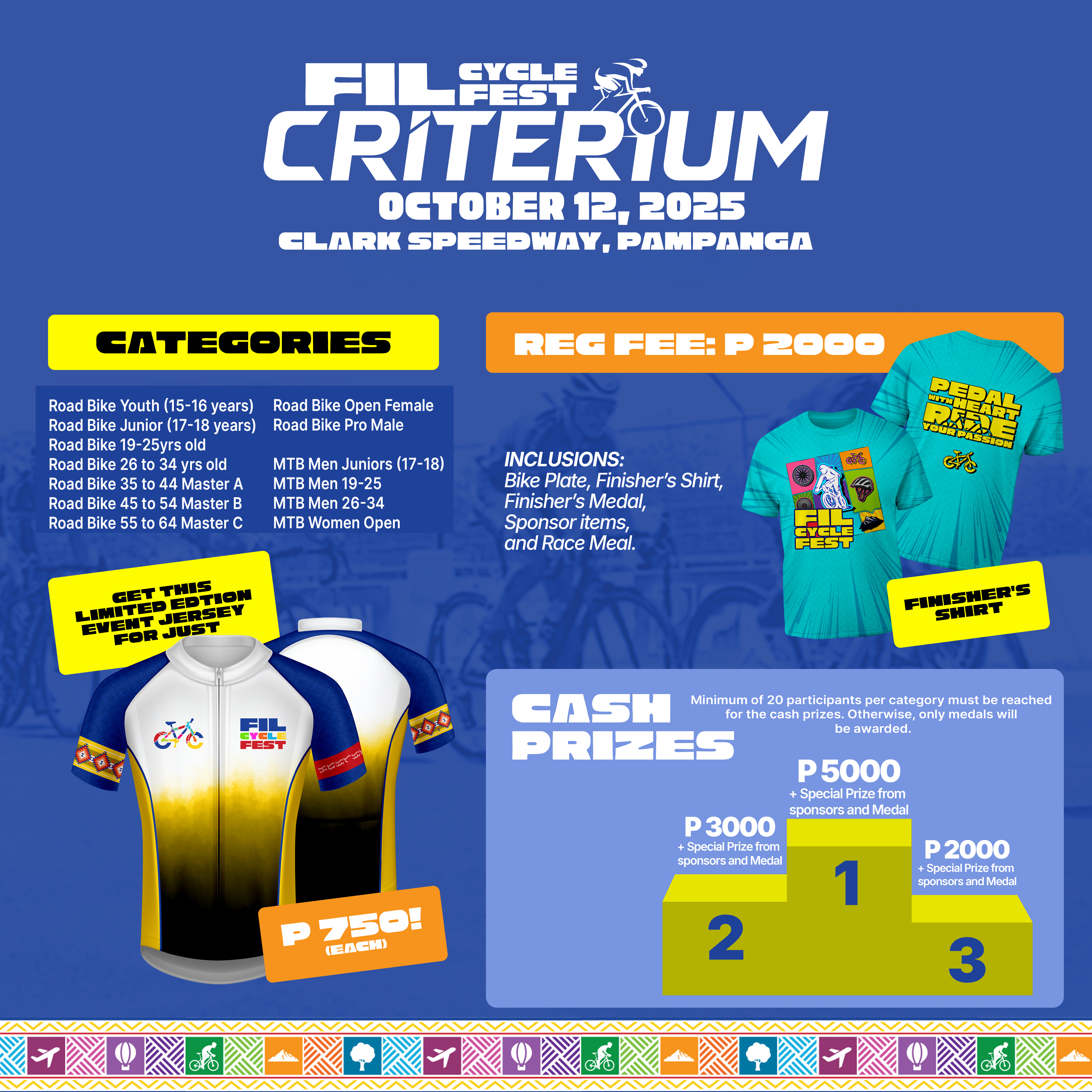 The Filipino Cycling Festival CRITERIUM will take place in Clark Speedway, Pampanga with a course of 4.189Kms for one (1) Lap.
